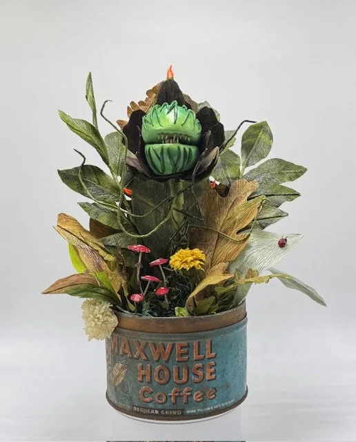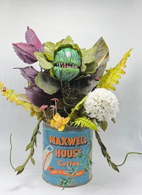Straight from the dark side of the greenhouse, this creepy-cute creature is hungry for Halloween fun. This alien plant is styled in a vintage coffee tin with half faux-liage and half fright.